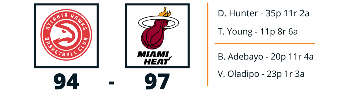 The Miami Heat have put on one of the greatest defensive performances throughout an entire series I've ever witnessed, and today was no different. For most of the second half they led by 10 to 15 points, absolutely incarcerating Trae Young. They held the star guard to 11 points on 2-12 shooting and forced 6 turnovers on him. With Ice Trae suffering in basketball hell, the offensive load surprisingly fell to De'Andre Hunter, who beautifully rose to the occasion. The third-year guard who averaged 13ppg exploded for 35 points and was taking Heat defenders off the dribble, hitting pull-up threes, and drawing fouls inside in order to bring the Hawks back into the game. It was a joy to see a young gun blossom when his team needed him most.