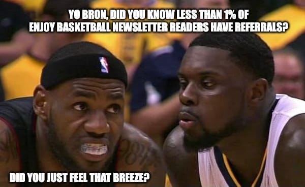 Lance: Aye Bron, did you know less than 1% of Enjoy Basketball readers have referred the newsletter to their friends?