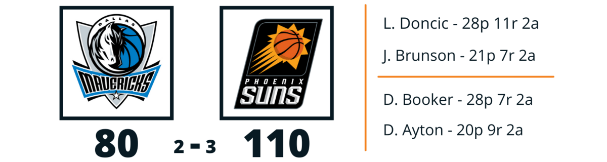 This game was really, really close until it really, really wasn't. In the first half, the two sides traded buckets and the defenses especially shined, limiting the score to 49-46 in favor of Phoenix. But then Dallas offense completely froze, scoring just just 34 in the second half to Phoenix's 61.