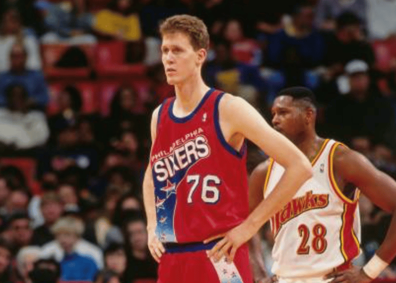 When Shawn Bradley was drafted by Philadelphia with the second pick in the 1993 draft, he became one of the top three tallest players in league history at seven feet, six inches. What should a 7’6” player for the 76ers wear? #76, of course! And weirdly enough, his FT% during his final year in Philly was 76%…