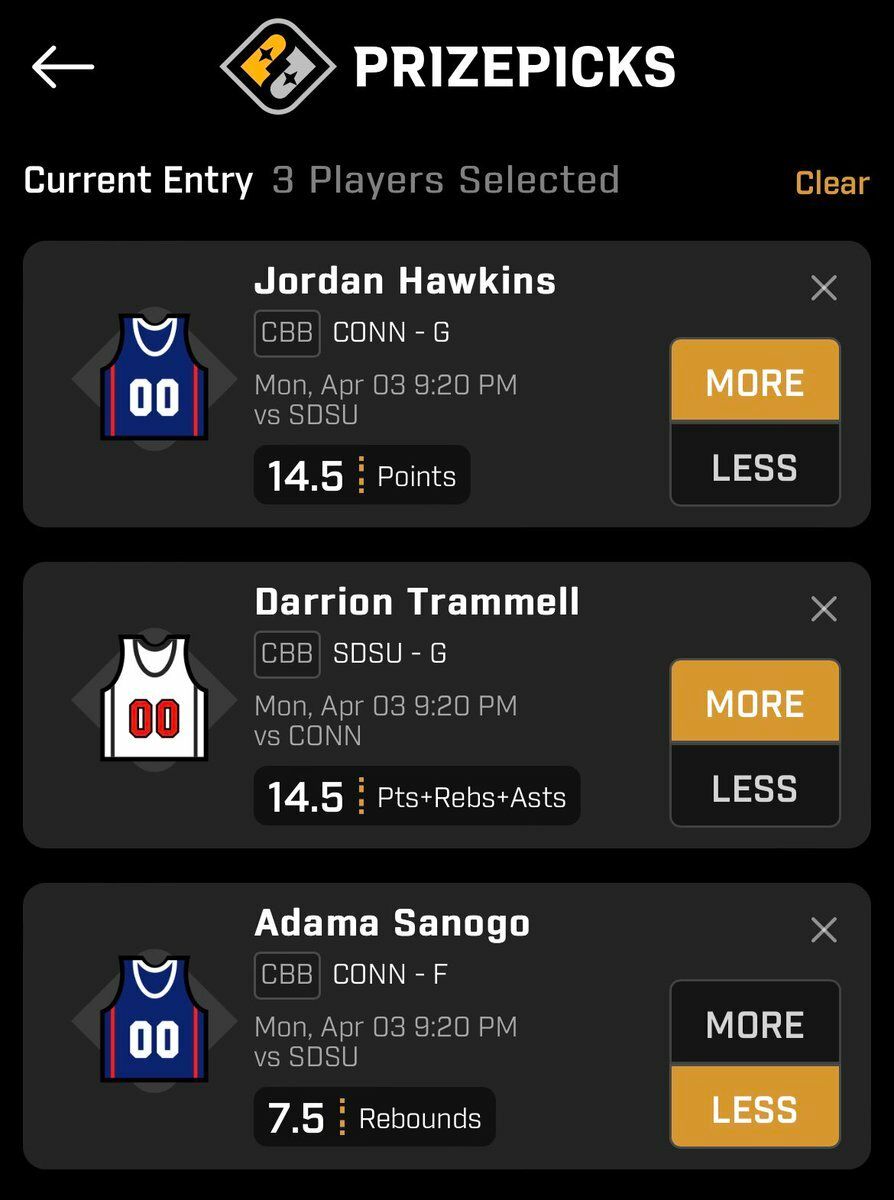 Think of the most exciting NBA game you’ve ever watched. Want every game to feel like that? Well, we’re gonna let you in on a little secret: with PrizePicks, every game can. You’ll be multiplying your money faster than you can say “Collective Bargaining Agreement.” Go download PrizePicks, pick which 3-6 players you think will go over (or under) their projected stats in a game, then watch your predictions come true. DONE. Here are our Monday picks. No NBA, so we’re rocking with the NCAA Championship! Are you tailing us or fading us? 🧐