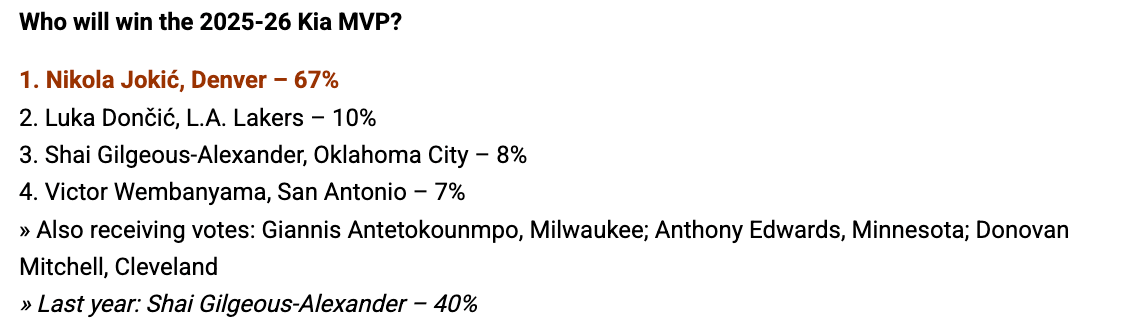Jokic takes the preseason MVP nod away from reigning winner Shai Gilgeous-Alexander, who finishes third behind Luka Doncic. SGA does get ranked as the best point guard in the league later in the survey, but something about already having won three MVPs boosted Jokic to the top of this one.