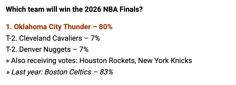 With Oklahoma City returning all their biggest talent and the vibes still riding high from last yearās championship, this choice was predictable. Does that mean the NBAās seven-year streak of unique champions is about to come to an end? Only time will tell⦠ā°