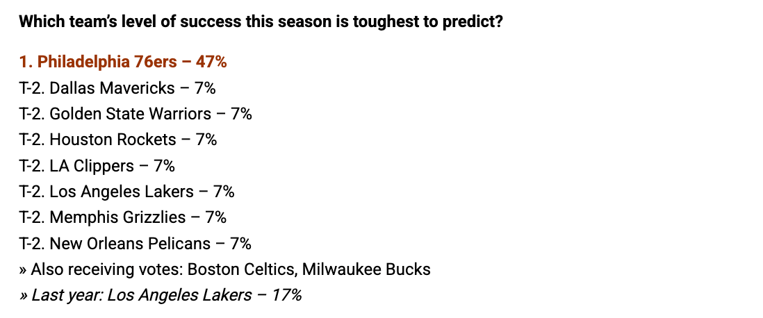 We wholeheartedly agree with the GMs on this one. How much will Joel Embiid and Paul George contribute (or play at all) this season? Will Jared McCain’s development be stunted, or could he compete for ROTY? And will Philadelphia be able to rely on rookie V.J. Edgecombe to be an instant starter?